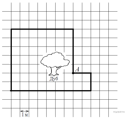 Версия для печати и копирования в MS WordУчёный кот обошёл вокруг дуба и вернулся в исходную точку. На рисунке показан путь кота вокруг дуба. Сторона квадратной клетки равна 1 м.
