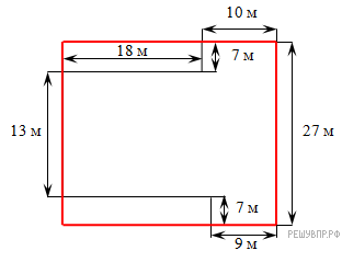 Найдем периметр пруда: 13 + 18 + 7 + 10 + (13 + 7 + 7) + 9 + 7 + (10 − 9 + 18) = 110 м.