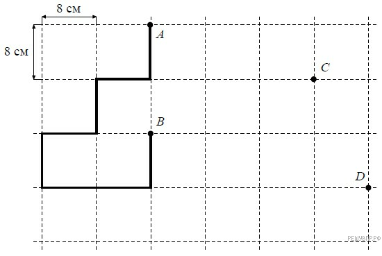 Лист бумаги расчерчен на квадраты со стороной 8 см. От точки А к точке В проведена ломаная по сторонам квадратов.